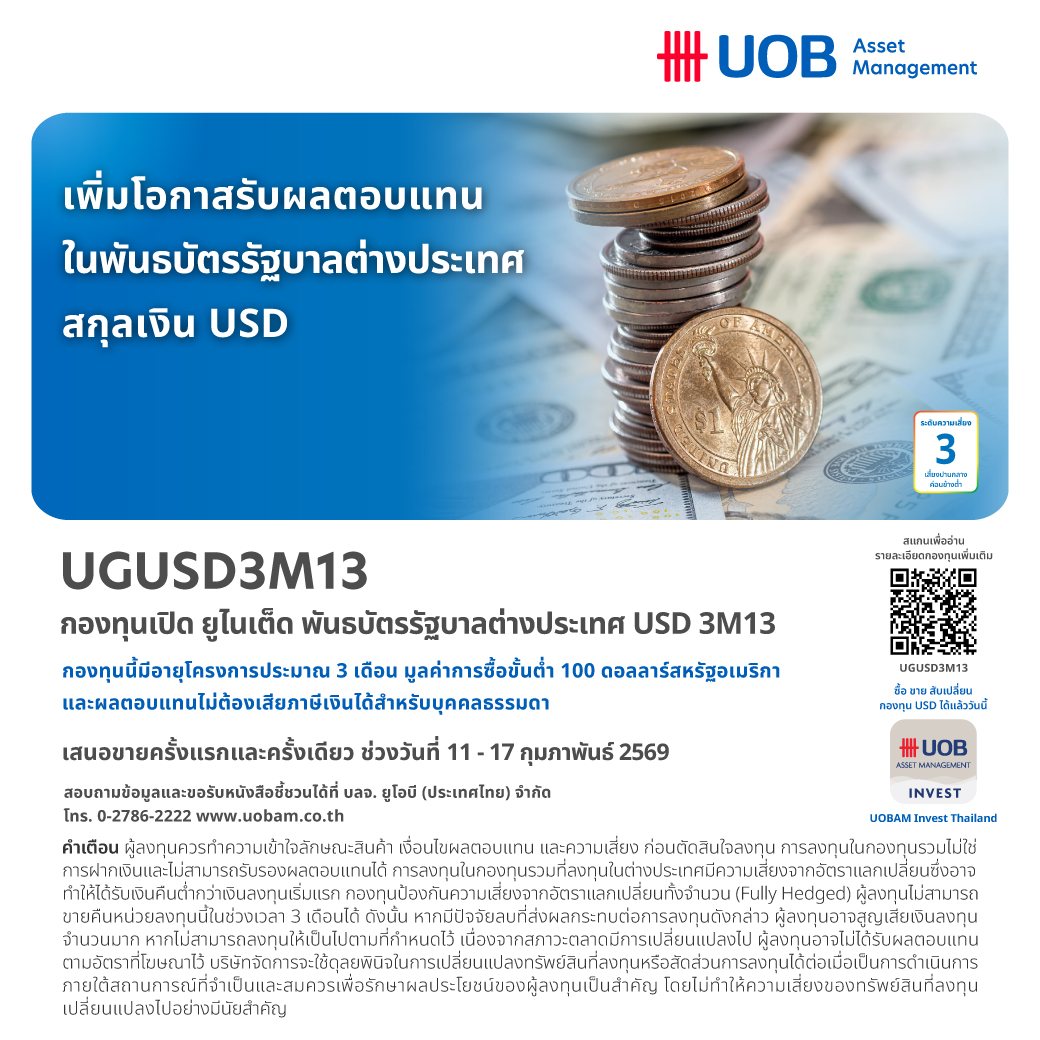 บลจ.ยูโอบี นำเสนอโอกาสการลงทุนในพันธบัตรภาครัฐบาลต่างประเทศสกุลเงินดอลลาร์สหรัฐ กองทุนเปิด ยูไนเต็ด พันธบัตรรัฐบาลต่างประเทศ USD 3M13 (UGUSD3M13) IPO 11-17 กุมภาพันธ์ 2569