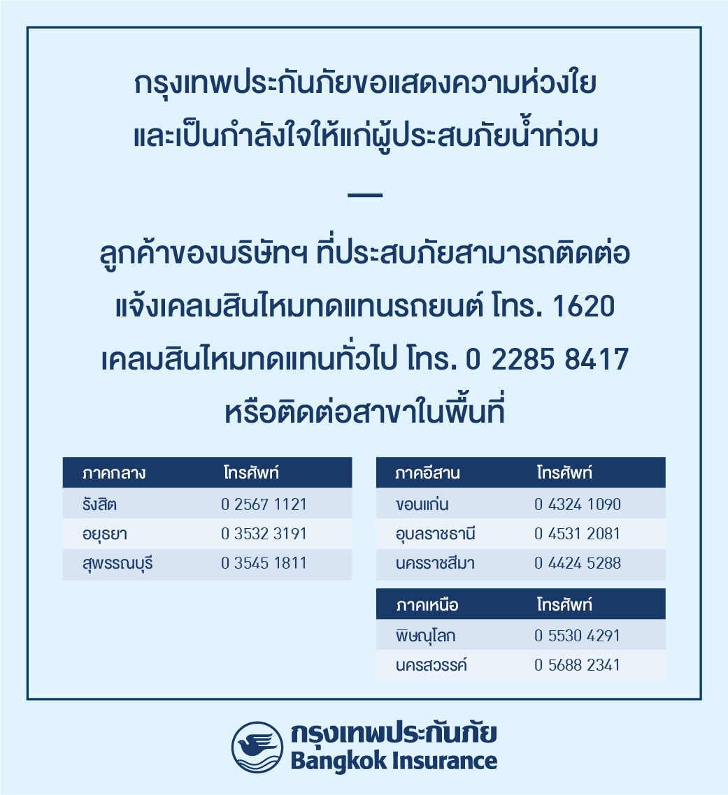 กรุงเทพประกันภัยห่วงใยผู้ประสบภัยน้ำท่วม พร้อมอำนวยความสะดวกด้านสินไหมทดแทน แก่ลูกค้า