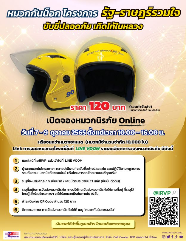 บริษัท กลางคุ้มครองผู้ประสบภัยจากรถ เชิญชวนจองหมวกนิรภัย โครงการ“รัฐ-ราษฎร์รวมใจ ขับขี่ปลอดภัย เทิดไท้ใน หลวง” ราคาพิเศษเพียง 100 บาท
