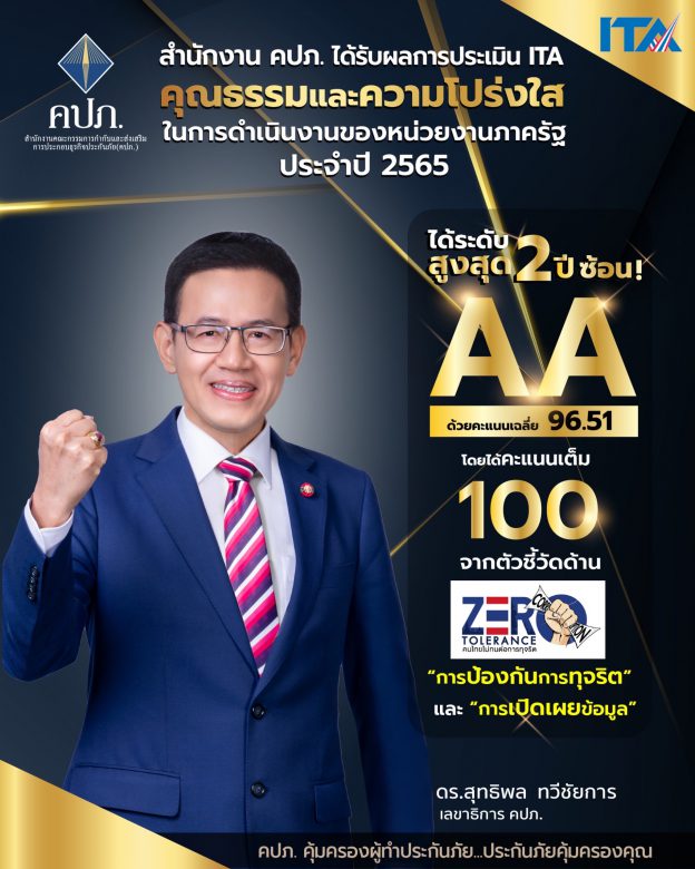 คปภ. คว้าระดับ AA สูงสุดที่ 96.51 คะแนน เป็นปีที่สองติดต่อกัน ในการประเมินคุณธรรมและความโปร่งใส ในการดำเนินงานของหน่วยงานภาครัฐ ประจำปี 2565