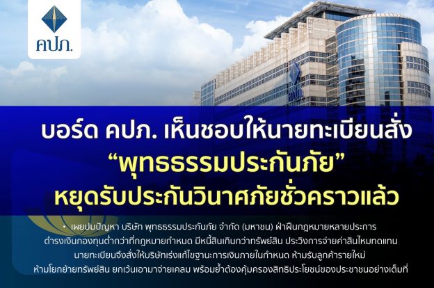 บอร์ด คปภ. เช็คบิล “พุทธธรรมประกันภัย” หยุดรับประกันวินาศภัย เผยปมปัญหา ฝ่าฝืนกฎหมายหลายประการ เงินกองทุนต่ำกว่าที่กฎหมายกำหนด มีหนี้สินมากกว่าทรัพย์สิน ประวิงการจ่ายค่าสินไหมทดแทน