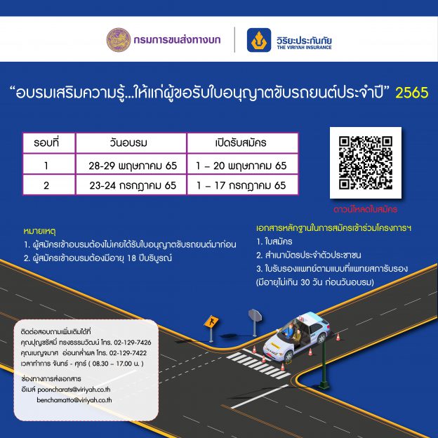 วิริยะฯ – กรมการขนส่งฯ จัดอบรมผู้ขอรับใบอนุญาตขับรถยนต์ ปี 65 เปิด 2 รุ่น “28-29 พ.ค. – 23-24 ก.ค.”