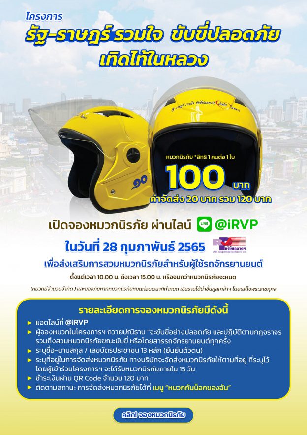 บริษัท กลางฯ เปิดจองหมวกนิรภัย โครงการ“รัฐ-ราษฎร์รวมใจ ขับขี่ปลอดภัย เทิดไท้ในหลวง” ผ่านไลน์ @iRVP