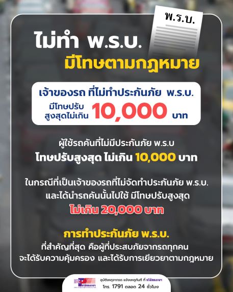 เตือนผู้ใช้รถใช้ถนน !!!…หากนำรถที่ไม่มี ประกันภัย พ.ร.บ.มาใช้ มีความผิดตามกฎหมาย ที่สำคัญเมื่อเกิดอุบัติเหตุ “ผู้ประสบเหตุจะไม่ได้รับความคุ้มครองตามกฎหมาย”