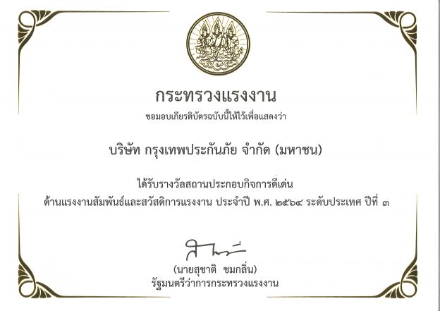 BKI รับรางวัลสถานประกอบกิจการดีเด่น ประจำปี 2564 ต่อเนื่องเป็นปีที่ 3