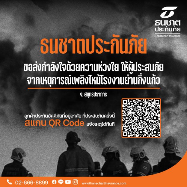 ธนชาตประกันภัย ห่วงใยผู้ประสบภัยเพลิงไหม้โรงงานย่านกิ่งแก้ว มอบอุปกรณ์ป้องกันให้เจ้าหน้าที่มูลค่า 1 แสนบาท พร้อมดูแลลูกค้า ประกันอัคคีภัยที่อยู่อาศัย และ ประกันภัยรถยนต์ อย่างเต็มที่