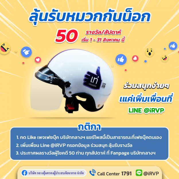 แอดไลน์เป็นเพื่อนกับบริษัทกลางฯ ผ่านไลน์ @iRVP เดือนสิงหาคมนี้ ลุ้นรับหมวกนิรภัยฟรีทุกสัปดาห์