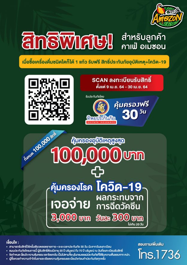 ทิพยประกันภัย ร่วมกับ คาเฟ่ อเมซอน มอบสิทธิ์ประกันภัยอุบัติเหตุส่วนบุคคลและประกันโควิด-19 ให้ลูกค้า คาเฟ่ อเมซอน 1 แสนสิทธิ์ฟรีทุนประกันภัย 1 แสนบาท คุ้มครอง 30 วัน