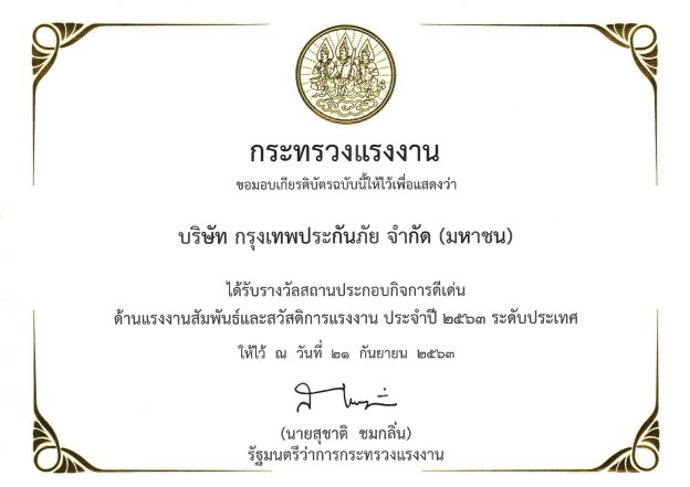 BKI รับรางวัลสถานประกอบกิจการดีเด่นด้านแรงงานสัมพันธ์และสวัสดิการแรงงาน ประจำปี 2563