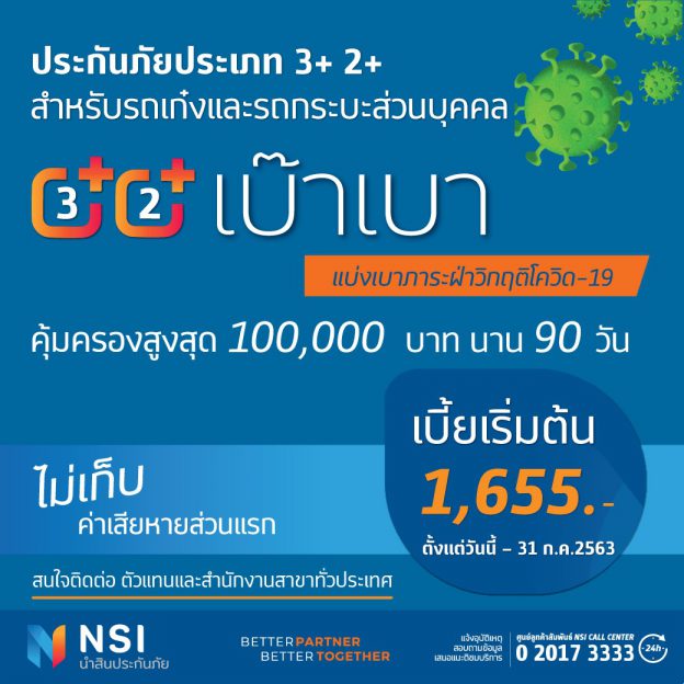 NSI นำสินประกันภัย ออกประกันรถคุ้มครองระยะสั้น “3+ 2+ เบ๊าเบา” คุ้มครอง 1 แสน นาน 3 เดือน