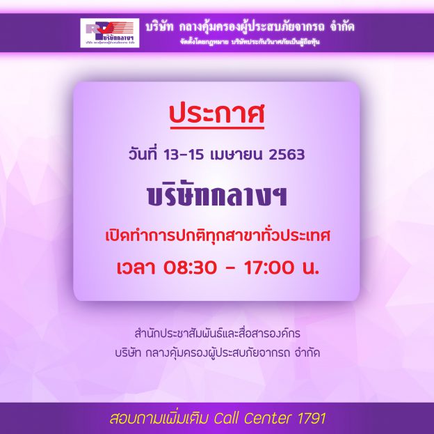 กลางคุ้มครองผู้ประสบภัยจากรถ จำกัด แจ้งประกาศเปิดทำการตามปกติในวันที่ 13-15 เมษายน 2563