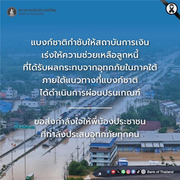 ธปท. ขอให้สถาบันการเงินเร่งช่วยเหลือลูกหนี้ที่ได้รับผลกระทบจากสถานการณ์อุทกภัยในพื้นที่ภาคใต้