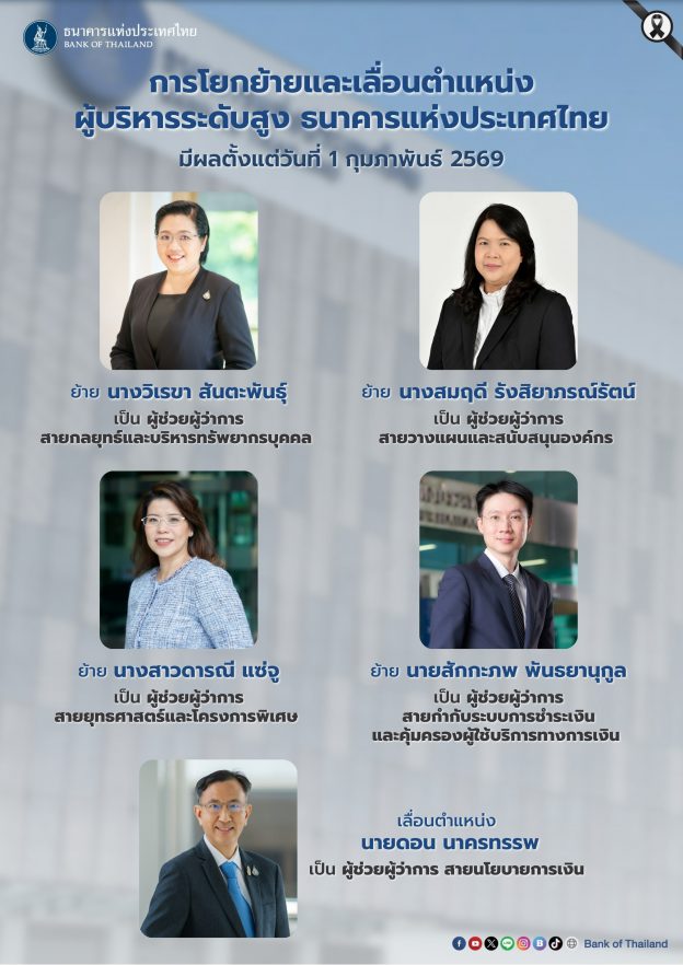 ธนาคารแห่งประเทศไทย ประกาศการโยกย้ายและเลื่อนตำแหน่งผู้บริหารระดับสูง