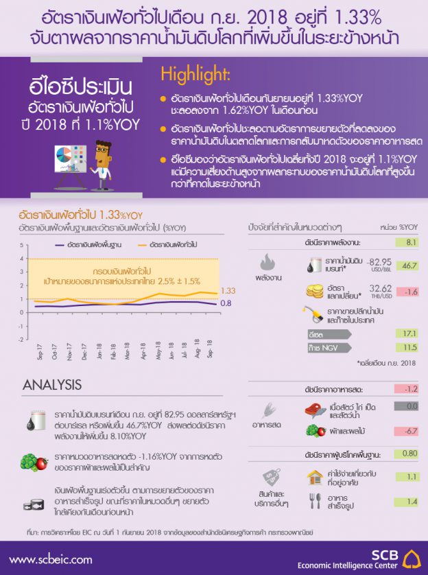 อัตราเงินเฟ้อทั่วไปเดือน ก.ย. 2018 อยู่ที่ 1.33% จับตาผลกระทบจากราคาน้ำมันดิบโลกที่เพิ่มขึ้น