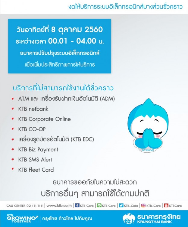 ย้ำเตือน…กรุงไทยปิดระบบอิเล็กทรอนิกส์ชั่วคราว วันที่ 8 ต.ค.นี้น่ะ ##