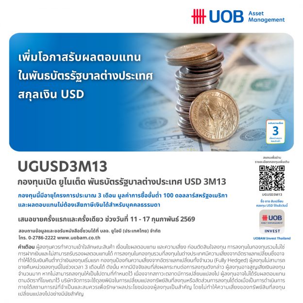 บลจ.ยูโอบี นำเสนอโอกาสการลงทุนในพันธบัตรภาครัฐบาลต่างประเทศสกุลเงินดอลลาร์สหรัฐ กองทุนเปิด ยูไนเต็ด พันธบัตรรัฐบาลต่างประเทศ USD 3M13 (UGUSD3M13) IPO 11-17 กุมภาพันธ์ 2569