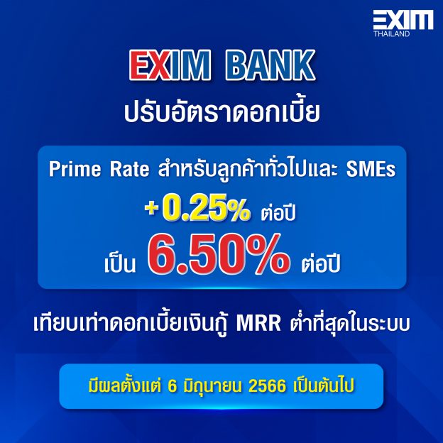 EXIM BANK ประกาศปรับอัตราดอกเบี้ย Prime Rate 0.25% ต่อปี จาก 6.25% ต่อปี เป็น 6.50% ต่อปี