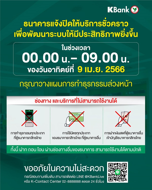 กสิกรไทย แจ้งปิดปรับปรุงระบบ 9 เม.ย.นี้