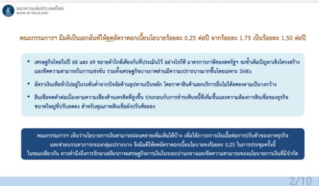 กนง.ประกาศลดอัตราดอกเบี้ยนโยบายลง 0.25%