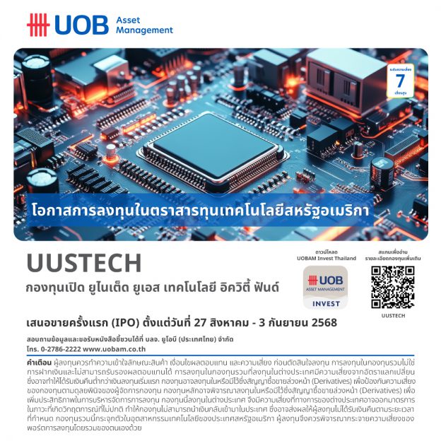 บลจ.ยูโอบี เปิดตัว “กองทุนเปิด ยูไนเต็ด ยูเอส เทคโนโลยี อิควิตี้ ฟันด์ (UUSTECH)” กองทุน Feeder ตราสารทุนเทคโนโลยีสหรัฐฯ กองทุนแรกในไทยที่ลงทุนผ่านกองทุนหลักซึ่งใช้กลยุทธ์การลงทุนเชิงรุก เสนอขายครั้งแรก ระหว่างวันที่ 27 สิงหาคม – 3 กันยายน 2568