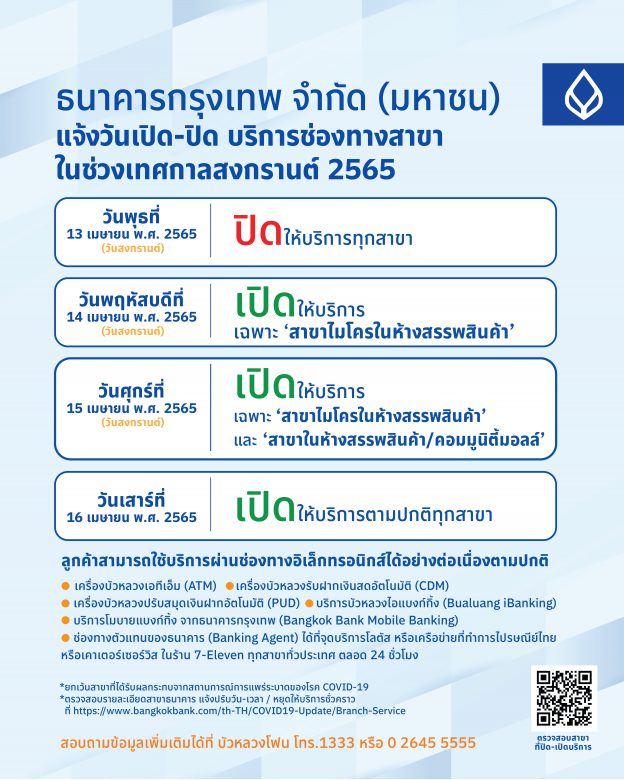 ธนาคารกรุงเทพ สำรองเงินสดช่วงสงกรานต์ 35,000 ล้านบาท แนะลูกค้าทำธุรกรรมทางการเงินผ่านช่องทางอิเล็กทรอนิกส์