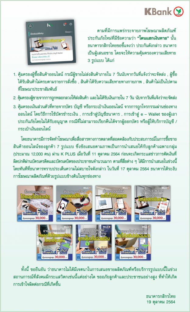 ธนาคารกสิกไทย ชี้แจงผลิตภัณฑ์ประกันภัยใหม่ ที่มีข้อความว่า “โดนแฮกเงินหาย”