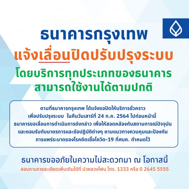 ธนาคารกรุงเทพ แจ้งเลื่อนปิดปรับปรุงระบบ โดยบริการทุกประเภทของธนาคารสามารถใช้งานได้ตามปกติ