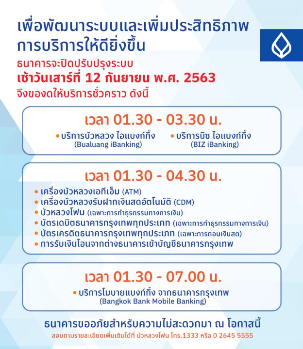 ธนาคารกรุงเทพ แจ้งปิดปรับปรุงระบบชั่วคราว เพื่อพัฒนาและเพิ่มประสิทธิภาพการให้บริการลูกค้า