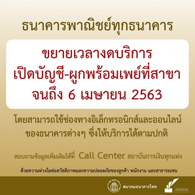 ธนาคารพาณิชย์ขยายเวลางดเปิดบัญชี-สมัครพร้อมเพย์ที่สาขา จนถึงวันที่ 6 เมษายน 2563