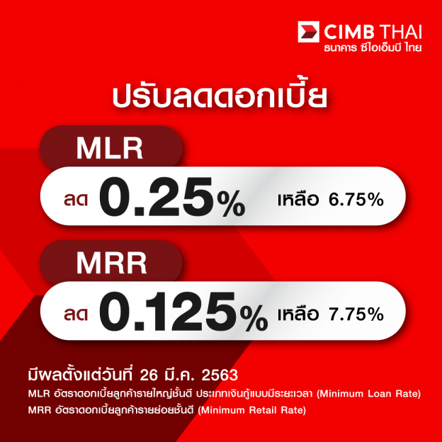 CIMB THAI ปรับลดดอกเบี้ยเงินกู้ MLR ลงเหลือ 6.75% และลด MRR…เหลือ 7.75% มีผลวันที่ 26 มี.ค. 2563 เป็นต้นไป
