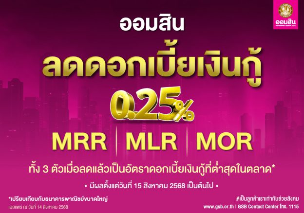 ออมสิน ประกาศลดดอกเบี้ยเงินกู้ทุกตัว 0.25% ทั้ง MRR MLR และ MOR หวังช่วยกระตุ้นเศรษฐกิจทั้งระบบ