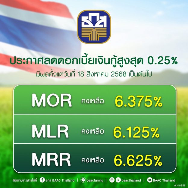 ธ.ก.ส. ประกาศลดอัตราดอกเบี้ยเงินกู้ สูงสุด 0.25% ต่อปี