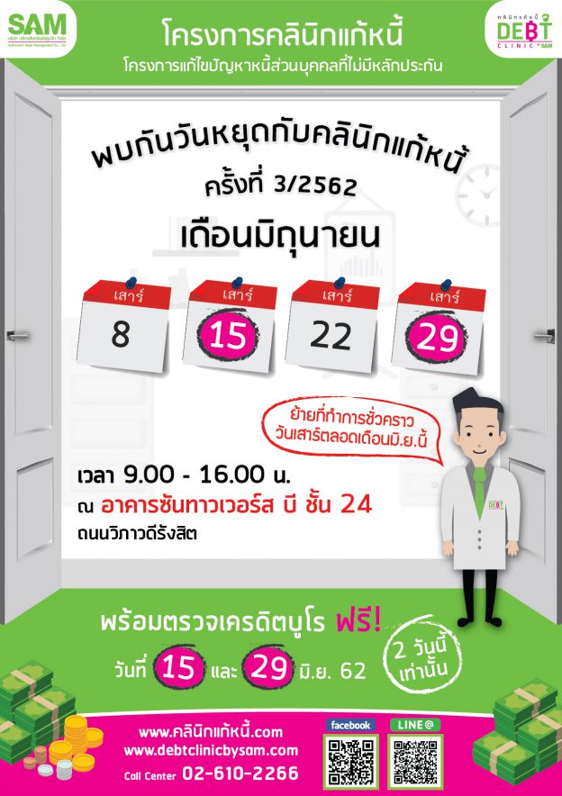 คลินิกแก้หนี้ นัดต่อเนื่อง “พบกันวันหยุด” ตลอดเดือน มิ.ย. 62
