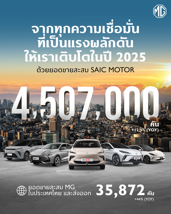 เอ็มจี ตอกย้ำความสำเร็จในตลาดยุโรป-อินเดีย-ไทย ดันยอดขายรวม SAIC MOTOR CORPORATION ปี 2025 พุ่ง 12.3% ทะลุ 4.507 ล้านคัน พร้อมขับเคลื่อนธุรกิจทั่วโลกสู่ศักราชใหม่ภายใต้กลยุทธ์ GLOCAL