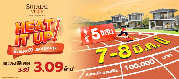 HEAT IT UP ซัมเมอร์นี้ ลดเยอะสุด! บ้านเดี่ยว–บ้านแฝด พร้อมอยู่ แปลงพิเศษเริ่ม 3.09 ล้านบาท* ที่ศุภาลัย วิลล์ วงแหวน–ลำลูกกา คลอง 7 พิเศษเฉพาะ 7–8 มีนาคมนี้*