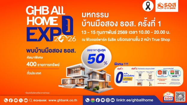 ธอส. จัดมหกรรม GHB ALL HOME EXPO 2026 วาเลนไทน์นี้ให้บ้านเป็นของขวัญ! ลดสูงสุด 50% ราคาเริ่มต้นเพียง 2.3 แสนบาท พร้อมโปรสินเชื่อดอกเบี้ย 0% ต่อปี พบกันวันที่ 13 – 15 กุมภาพันธ์ 2569 ณ ฟิวเจอร์พาร์ค รังสิต