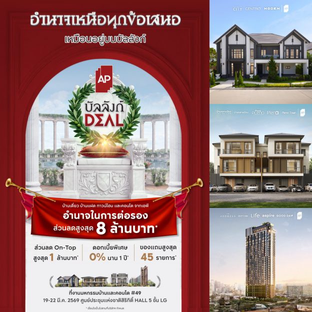 เอพี ไทยแลนด์ ส่งแคมเปญใหญ่ “บัลลังก์ DEAL” บุกงานมหกรรมบ้านและคอนโด มอบ “อำนาจ” ให้ลูกค้าเลือกดีลที่ดีที่สุดด้วยตนเอง ส่วนลดสูงสุดกว่า 8 ล้านบาท และ On-Top สูงสุดอีก 1 ล้านบาท