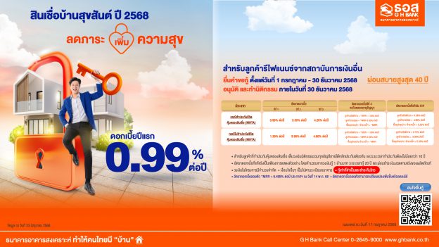 ธอส. ชวนรีไฟแนนซ์ลดภาระค่าครองชีพ กับ สินเชื่อบ้านสุขสันต์ ปี 2568 อัตราดอกเบี้ยปีแรกเพียง 0.99% ต่อปี กู้ 1 ล้านผ่อนเริ่มต้นเดือนละ 2,600 บาท เท่านั้น