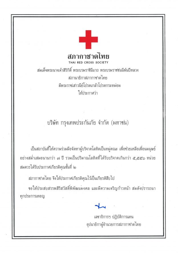 กรุงเทพประกันภัย รับประกาศเกียรติคุณจากสภากาชาดไทย