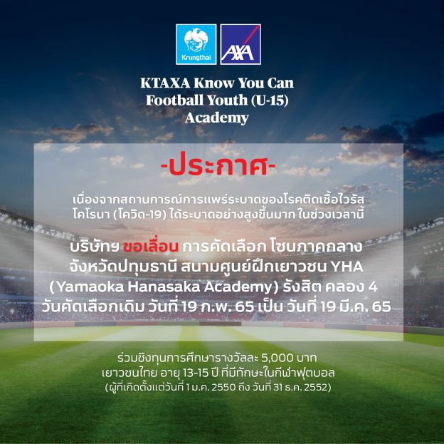กรุงไทย–แอกซ่า ประกันชีวิต ขอเลื่อนกิจกรรม KTAXA Know You Can Football Youth (U-15) Academy ปีที่ 2 โซนภาคกลาง