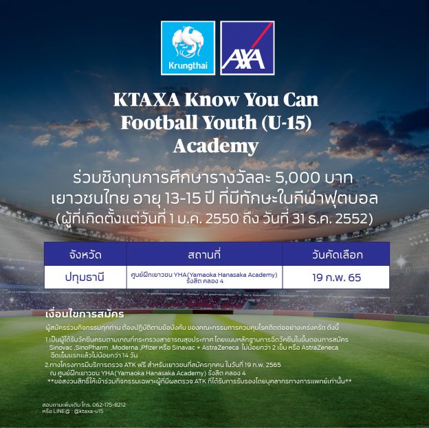 กรุงไทย–แอกซ่า ประกันชีวิต ขอเชิญชวนเยาวชน อายุ 13-15 ปี เข้าร่วมโครงการ KTAXA Know You Can Football Youth (U-15) Academy ปีที่ 2 (ภาคกลาง)