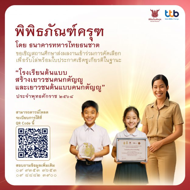 ทีทีบี เดินหน้าสร้างเยาวชนคุณภาพ ผ่านโครงการ “โรงเรียนต้นแบบสร้างคนกตัญญู” และ “เยาวชนต้นแบบคนกตัญญู” พร้อมเปิดโอกาสเยาวชนเรียนรู้คุณค่าทางวัฒนธรรมผ่าน “พิพิธภัณฑ์ครุฑ” สมัครได้ตั้งแต่วันนี้ ถึง 13 ต.ค. นี้