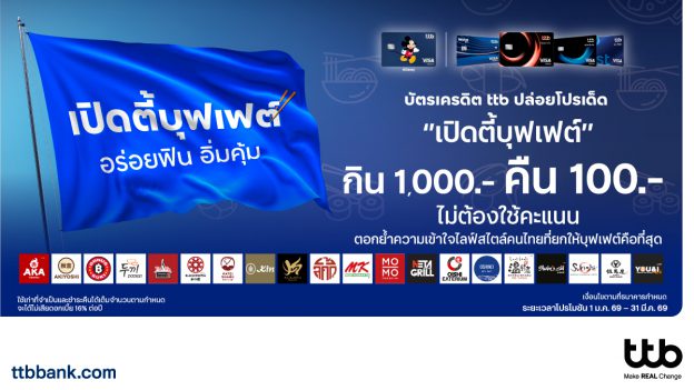 บัตรเครดิต ttb เปิดแคมเปญ “เปิดตี้บุฟเฟต์” กินครบ 1,000 บาท คืน 100 บาท ไม่ต้องแลกคะแนน