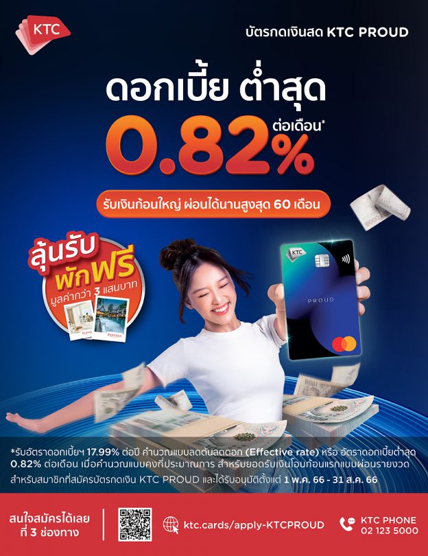 บัตรกดเงินสด “เคทีซี พราว” รับดอกเบี้ยต่ำสุด 0.82% ต่อเดือน และลุ้นรับแพ็คเกจห้องพักโรงแรมเครือเซนทารา