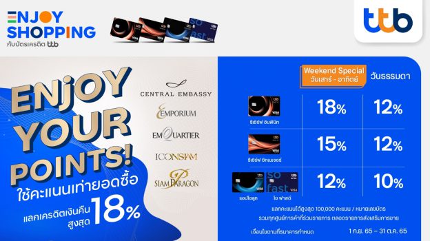 บัตรเครดิต ทีทีบี มอบสิทธิพิเศษเครดิตเงินคืนสูงสุด 18% เมื่อใช้คะแนนสะสมแลกเท่ายอดใช้จ่ายที่ 5 ศูนย์การค้าดัง
