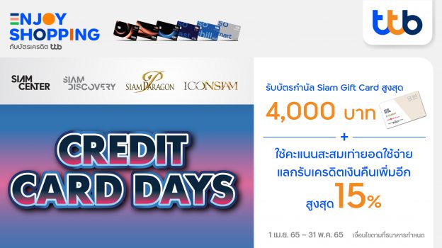 บัตรเครดิต ทีทีบี จัดแคมเปญ Credit Card Days เมื่อใช้จ่ายที่ศูนย์การค้าไอคอนสยาม และ วันสยาม รับบัตรกำนัล Siam Gift Card สูงสุด 4,000 บาท และ แลกรับเครดิตเงินคืนสูงสุด 15%