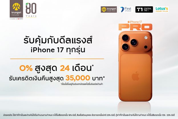 กรุงศรี คอนซูมเมอร์ จัดโปรผ่อน iPhone 17 0% นานสูงสุด 24 เดือน รับเครดิตเงินคืนสูงสุด 35,000 บาท