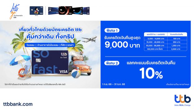 บัตรเครดิต ttb มอบสิทธิพิเศษ เที่ยวทั่วไทยคุ้มกว่าเดิมทั้งทริป รับเครดิตเงินคืนสูงสุด 9,000 บาท พร้อมสิทธิ์แลกคะแนนรับเครดิตเงินคืน 10%