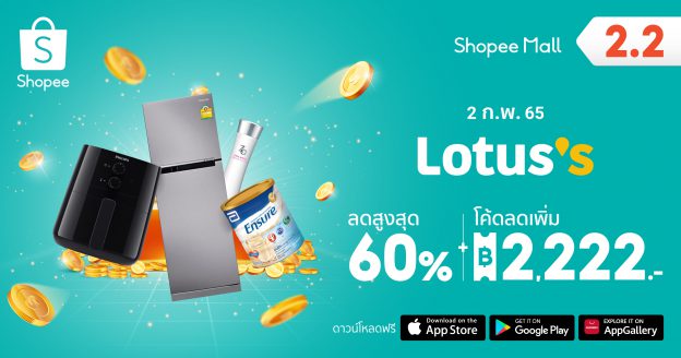 โลตัส เปิดดีลเด็ดแคมเปญ Shopee 2.2 Cashback Sale ลดสูงสุด 60% พร้อมโค้ดส่วนลดเพิ่ม 2,222 บาท…ให้นักช้อปซื้อของใหม่ๆ เข้าบ้าน เฮงๆ ปังๆ รับตรุษจีน