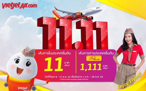 ฉลองมหกรรมลดกระหน่ำ 11.11 กับไทยเวียตเจ็ท ตั๋วโปรฯเริ่มต้น 11 บาท